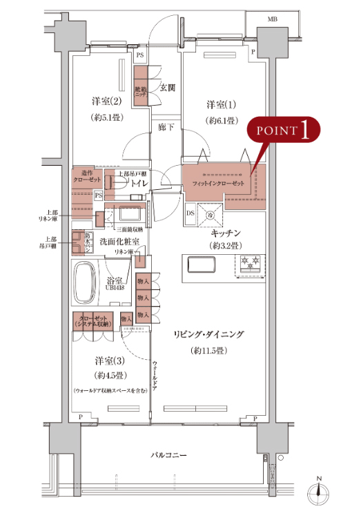 | 備考 | 【POINT1】 フィットインクローゼットをはじめ豊富な収納 2Wayで使える大型収納フィットインクローゼットをはじめ、リビング物入などきめ細やかな収納計画で、すっきりとした室内空間を演出。 |
