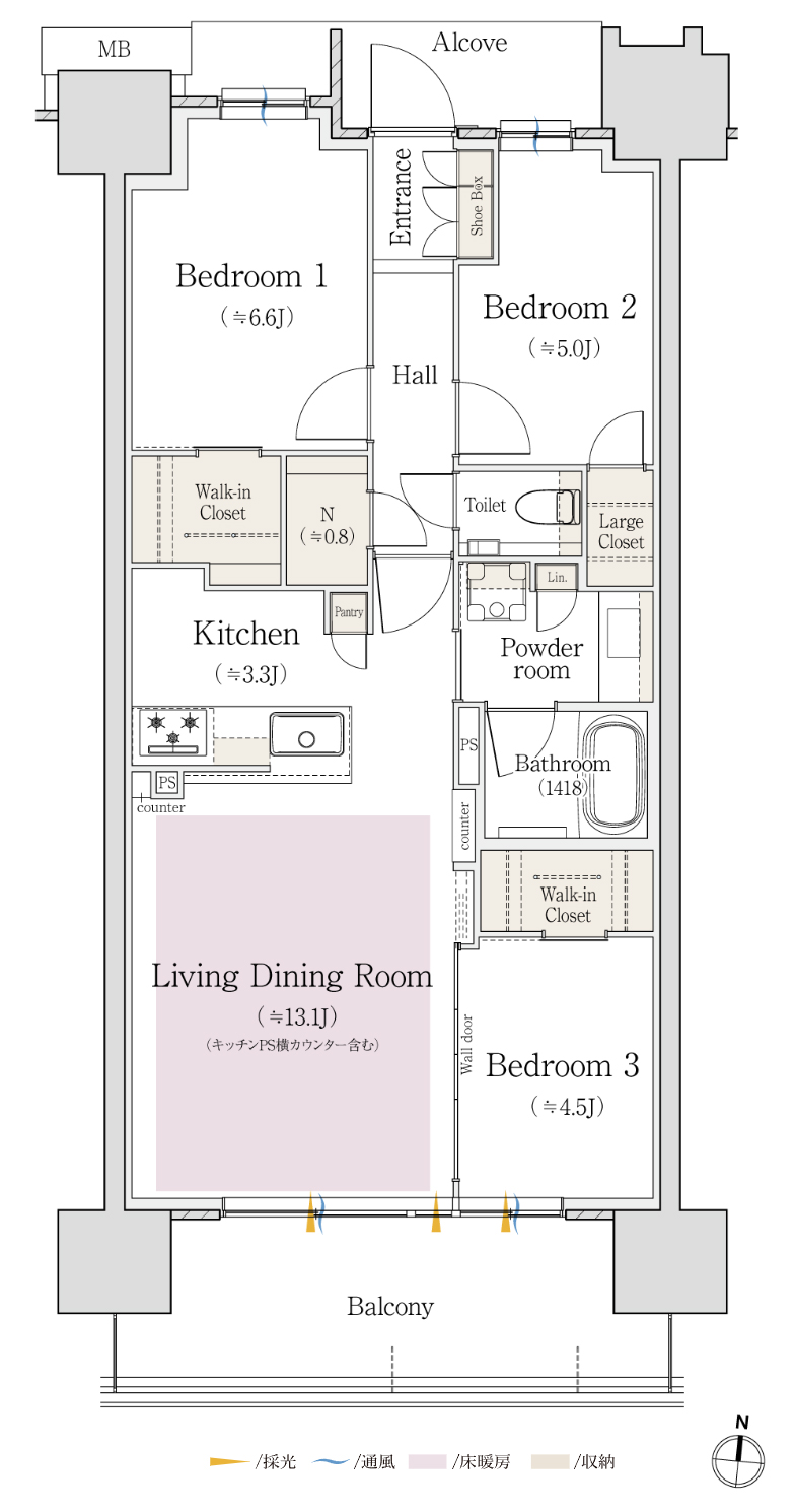 | 備考 | ■アウトポール設計のリビングダイニング ■2か所のウォークインクローゼット・ラージクローゼット ■ウォールドアを開放すると合計17.6帖のリビング・ダイニング空間 LC=ラージクローゼット |
