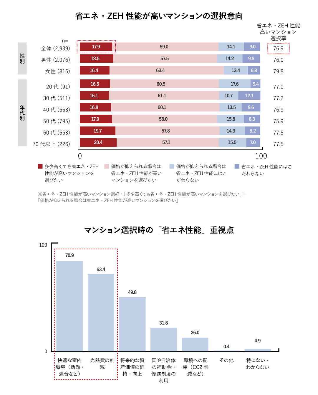 「省エネ・ZEH性能が高いマンションを選びたい」と回答した人は7割後半