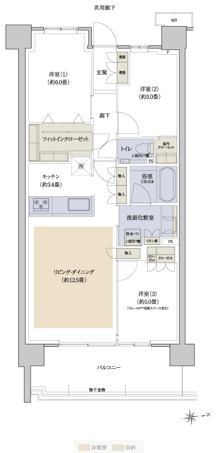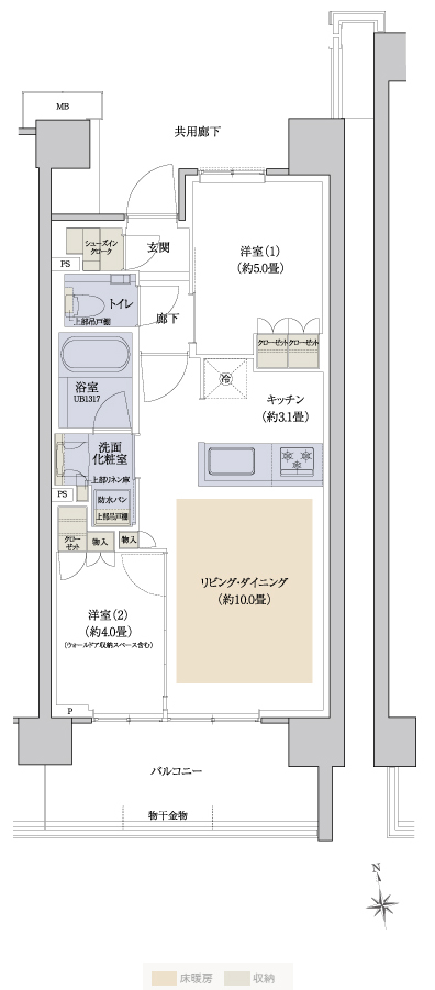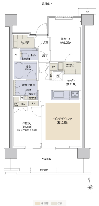 備考 | ■ウォールドアを開放すれば、一体利用できる南面2居室配置。 ■廊下が短く、空間を有効活用できる南向きプラン。 |