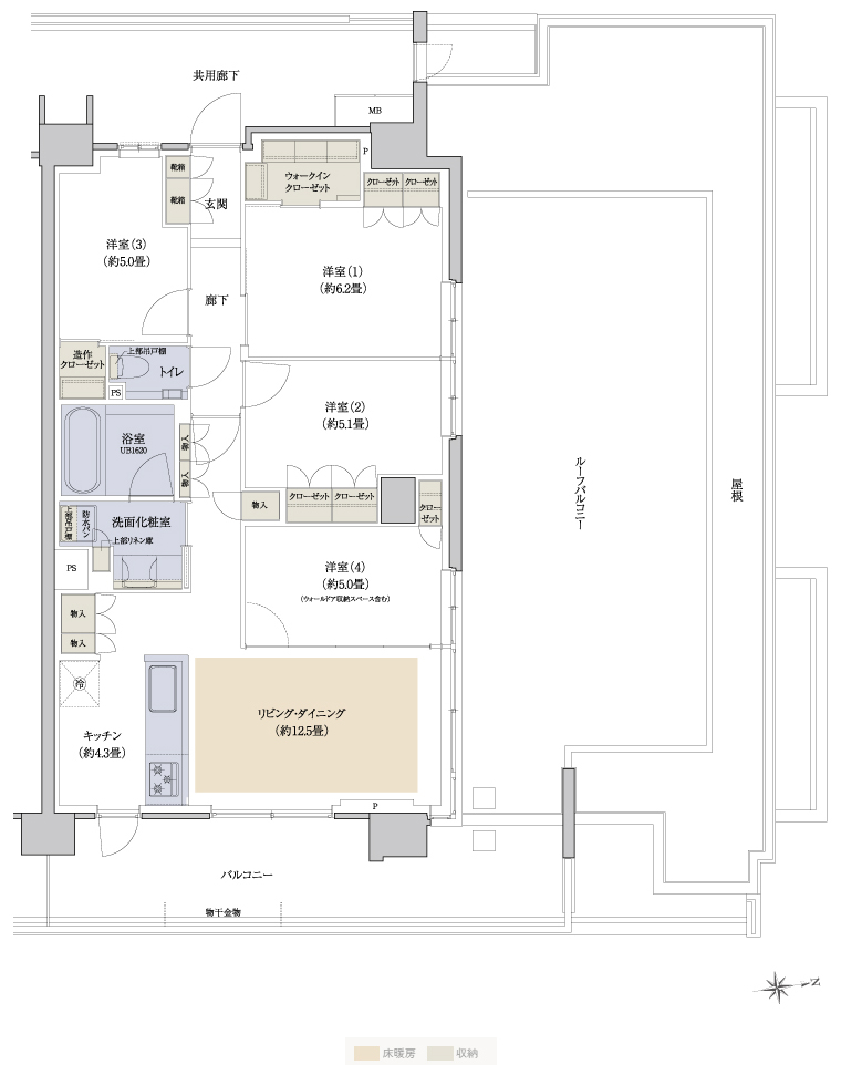 備考 | ■ひとつ上のゆとりを満喫する、4LDK・3面開口角住戸。 ■キッチン出入口も備えた開放的なプラン。暮らす楽しみが一層広がるルーフバルコニー付き。 |