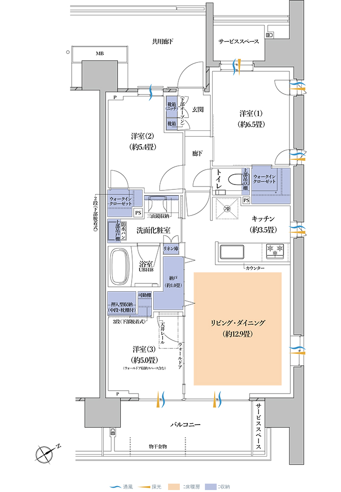 その他面積 | バルコニー面積(2・3階)/12.80㎡、(4~14階)/12.68㎡ |