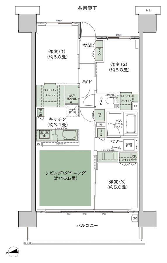 備考 | ●3面の開口部と2つのバルコニーを配し、明るく開放感にあふれる角住戸。 ●2面開口のリビング・ダイニングと一体利用できる洋室(3)を配置。 ●2つのウォークインクロゼットや納戸、物入、リネン庫など随所に収納をご用意。 ●バルコニーへ出入りできるキッチンは家族の会話も弾む対面カウンタータイプ。 |