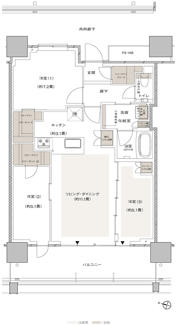 | 備考 | 【01】高い収納力を誇る3LDK約71m2プラン。 【02】帰宅後すぐに水回りに行けるから、いつでも清潔。 【03】洋室(3)とリビング・ダイニングをつなげて広々2LDKに。 【04】バルコニーに面している居室が多く明るく開放的。 |
