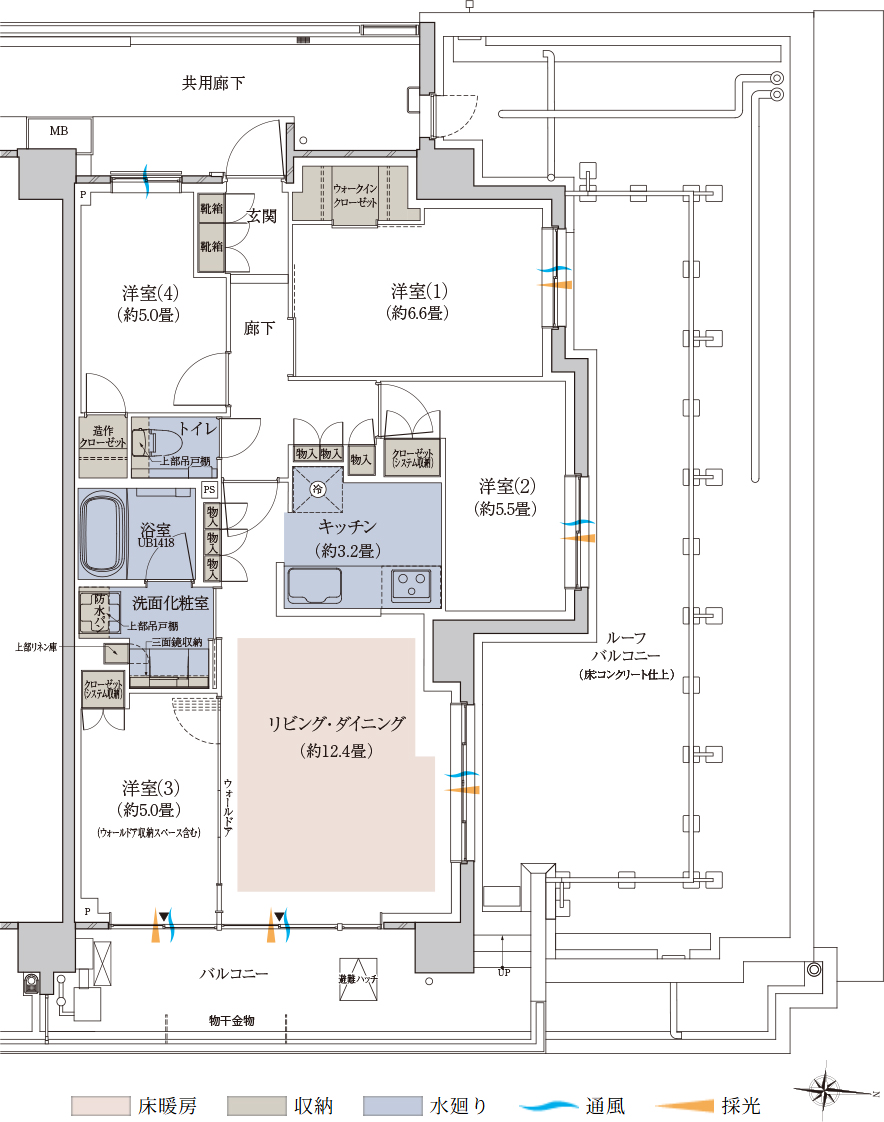 | 備考 | ■開放感と通風・採光に恵まれる南東角住戸。 ■洋室(1)はゆったり約6.8畳、全居室約5畳以上の広さを確保。 ■ダブルウォークインクローゼット+マルチストレージの豊富な収納。 MS=マルチストレージ |